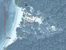 It appears that sand extends right along this section of coast in the above image. However in all 3 of my trips the sand between the two short horizontal red lines was deposited on the seabed rock shelf along with a lot of broken coral, bouldrs etc and even at lower tide times, water too deep in parts for easy wading extended right to the jungle-side rocks.