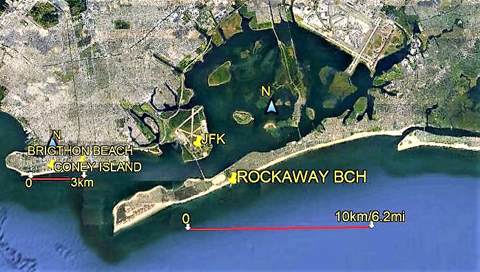 Note it isn't very far straight line from CONEY ISLAND - the centers of each longish beach are only 7mi/11km apart - the closest parts abt 2/3.2. But they're a hell of a lot further by transport - by road you are looking at over 12mi - by train 90mins. And ROCKAWAY is not a BROOKLYN beach - it's in the borough of QUEENS.